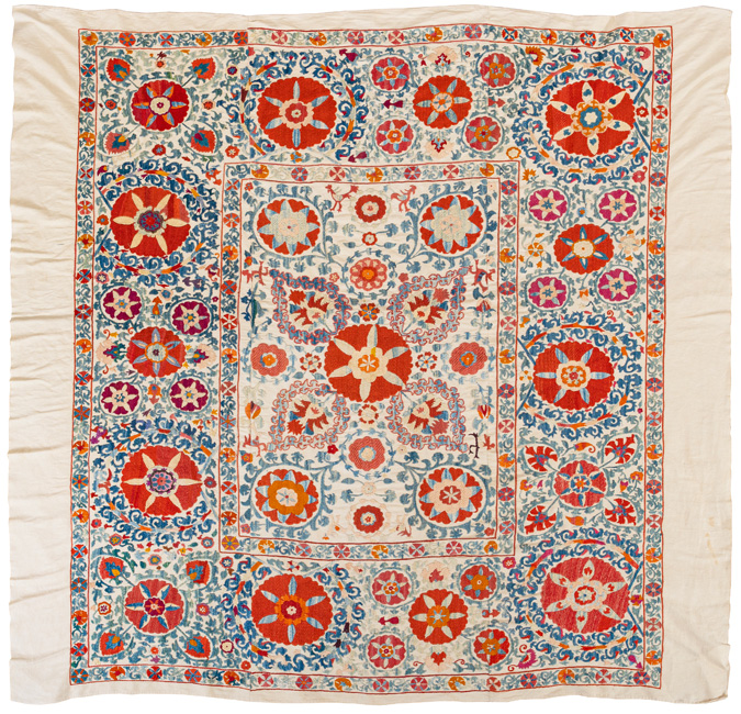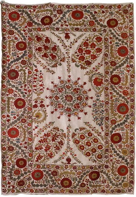 בסוזני ניתן להתרשם מעיטורים של פרחים, רימונים ועלים.